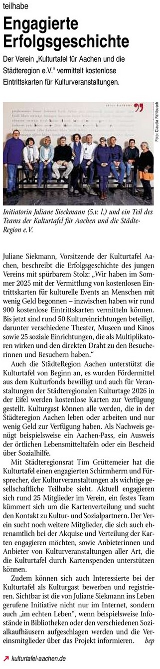 Die Aachener Wochenzeitung wirklich AACHEN veröffentlichte am 29. Januar 2026 einen weiteren Bericht zur Kooperation der Kulturtafel mit Kultureinrichtungen der Stadt Aachen.