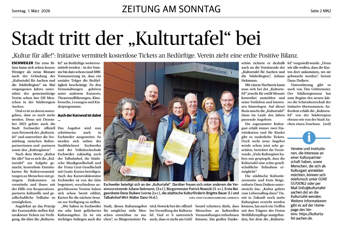 Die kostenlose Wochenzeitung Eschweiler Zeitung am Sonntag berichtete am 1. März 2026 über die Zusammenarbeit von Eschweiler und der Kulturtafel.